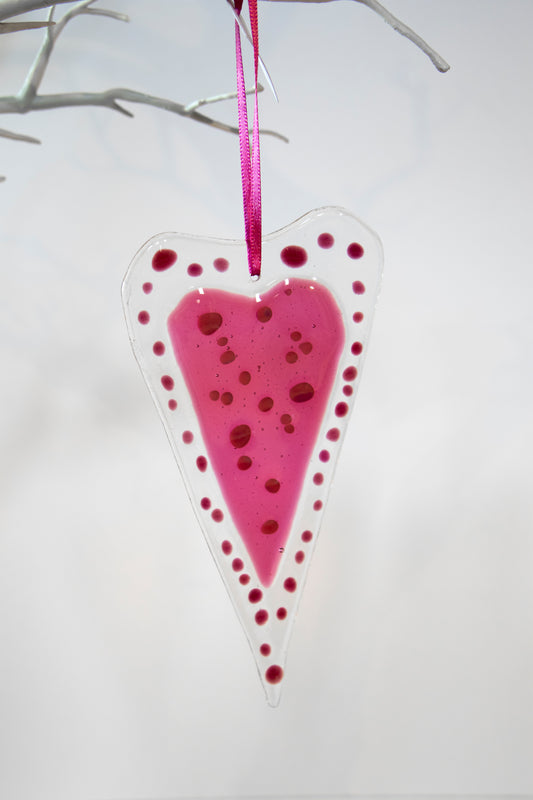 Pink Dotty Love Heart Fused Glass Hanging Decoration
