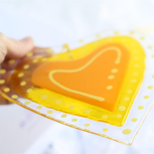 Katie's passion for colour, concept and form is evident in everything she makes. She began working with glass as a student at Chelsea School of Art, but it was when she had opportunity to work with fused glass that she found a process that allowed her design philosophy to come to life. The fluidity of molten glass enables a serendipitous approach to making which Katie embraces, enjoying the element of chance in her work's final form. Using hand cut glass, often with dichroic, millefiori, wire and paint details, Katie creates glass pieces that celebrate the wonky and the quirky in vibrant technicolour!
