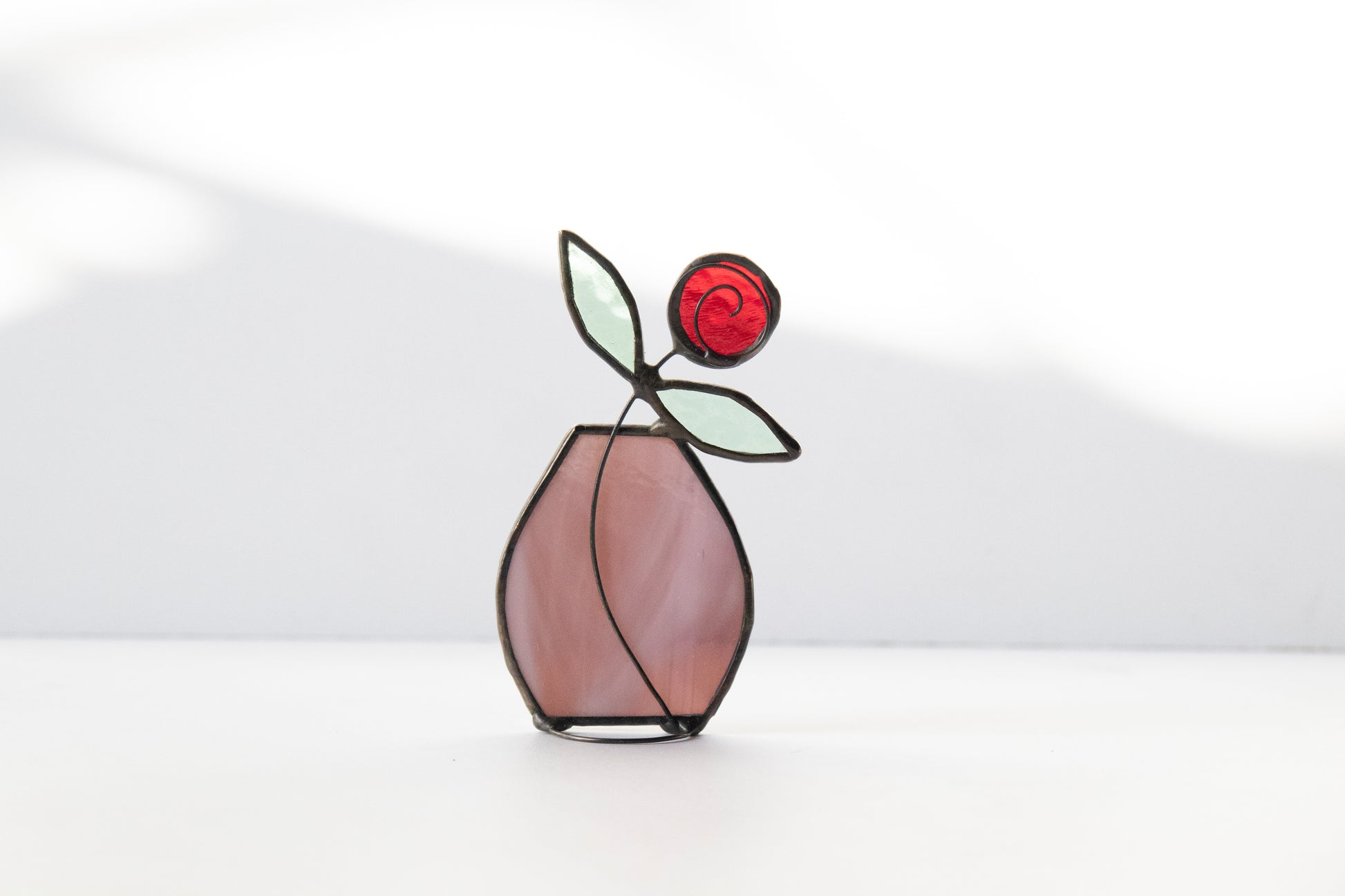 Small Flower Vase glass suncatcher handmade using the copper foil technique, incorporating ornamental wire work. Stands upright on an integrated wire base.
