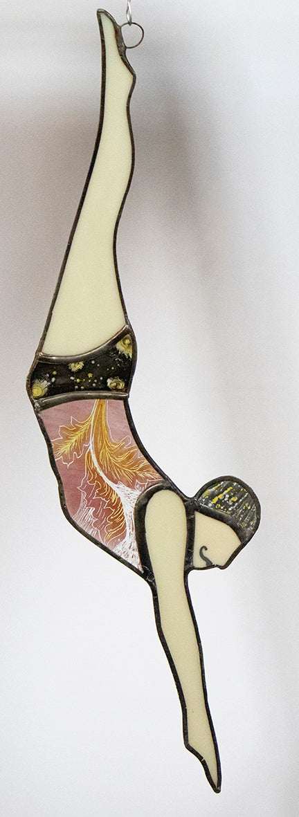 These are my handpainted pieces using specialist glass paints and silver stains by Reusche and Debitus. They are then kiln fired. This is the same method that has been used since the medieval times, and is inspired by my love of church windows and the feeling I get from being in water.