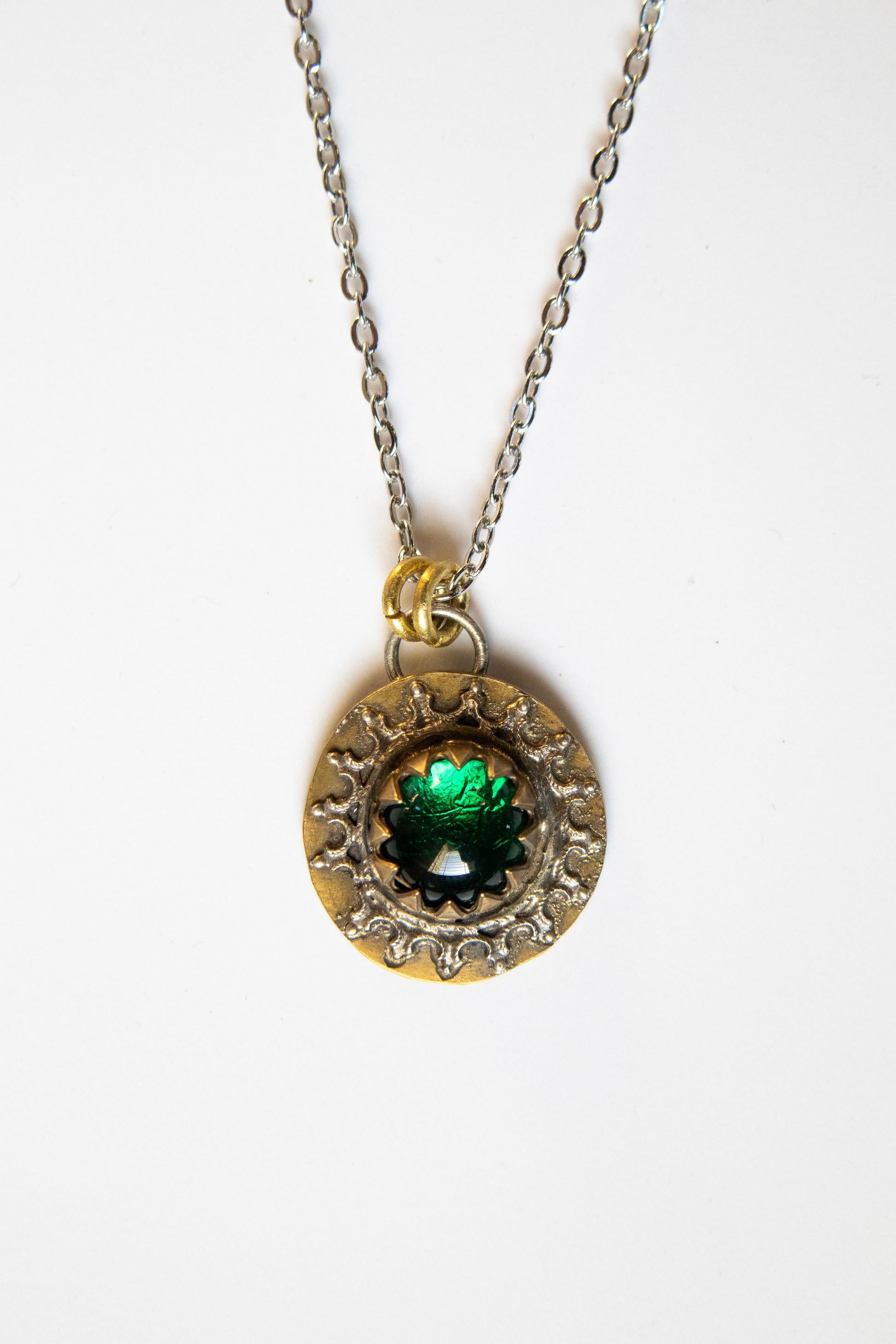 Green glass set in silver and brass. Pendant measures 20mm x 20mm and hangs from a 19" stainless steel chain.