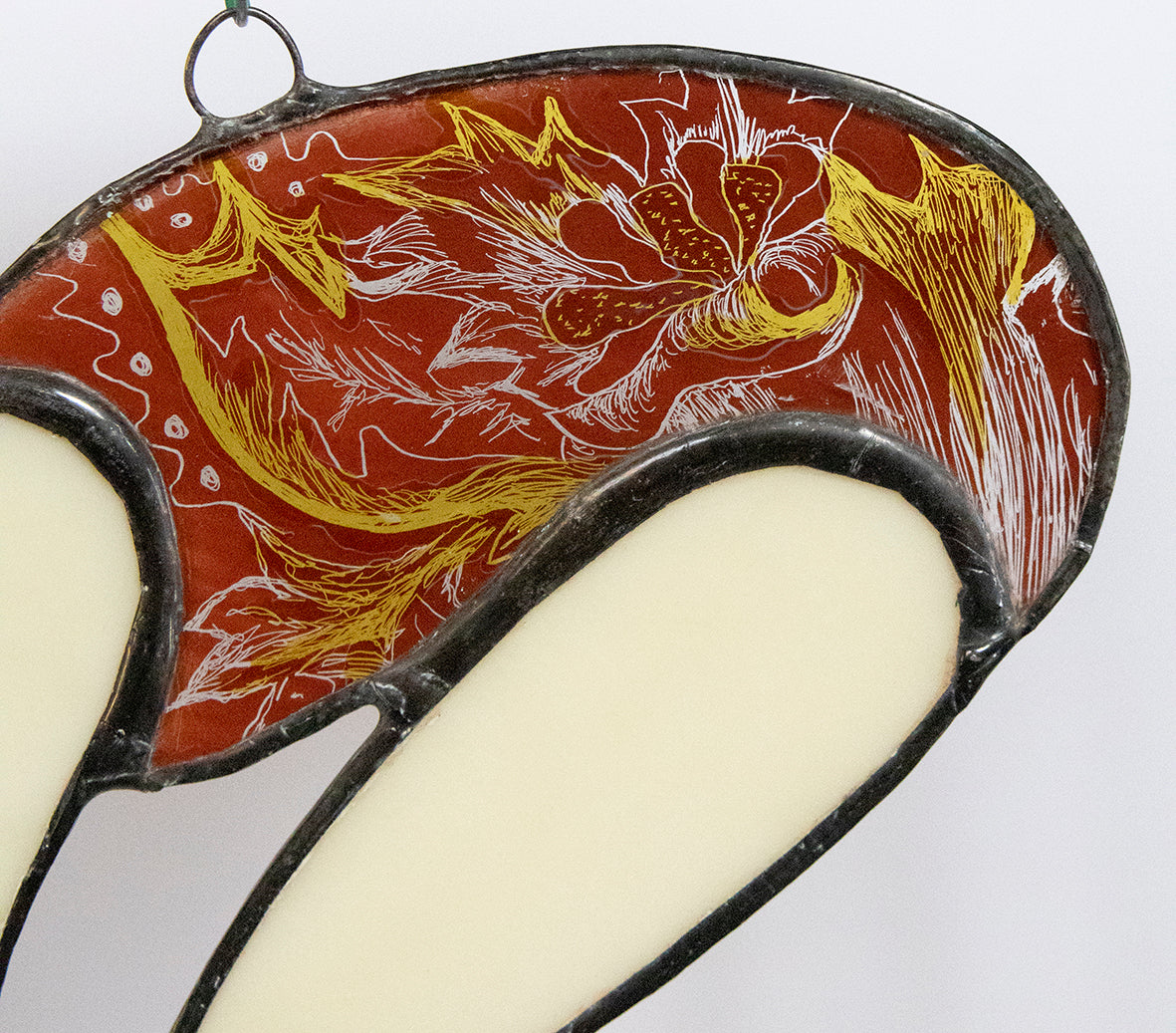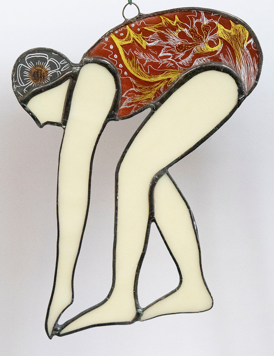 These are my handpainted pieces using specialist glass paints and silver stains by Reusche and Debitus. They are then kiln fired. This is the same method that has been used since the medieval times, and is inspired by my love of church windows and the feeling I get from being in water.