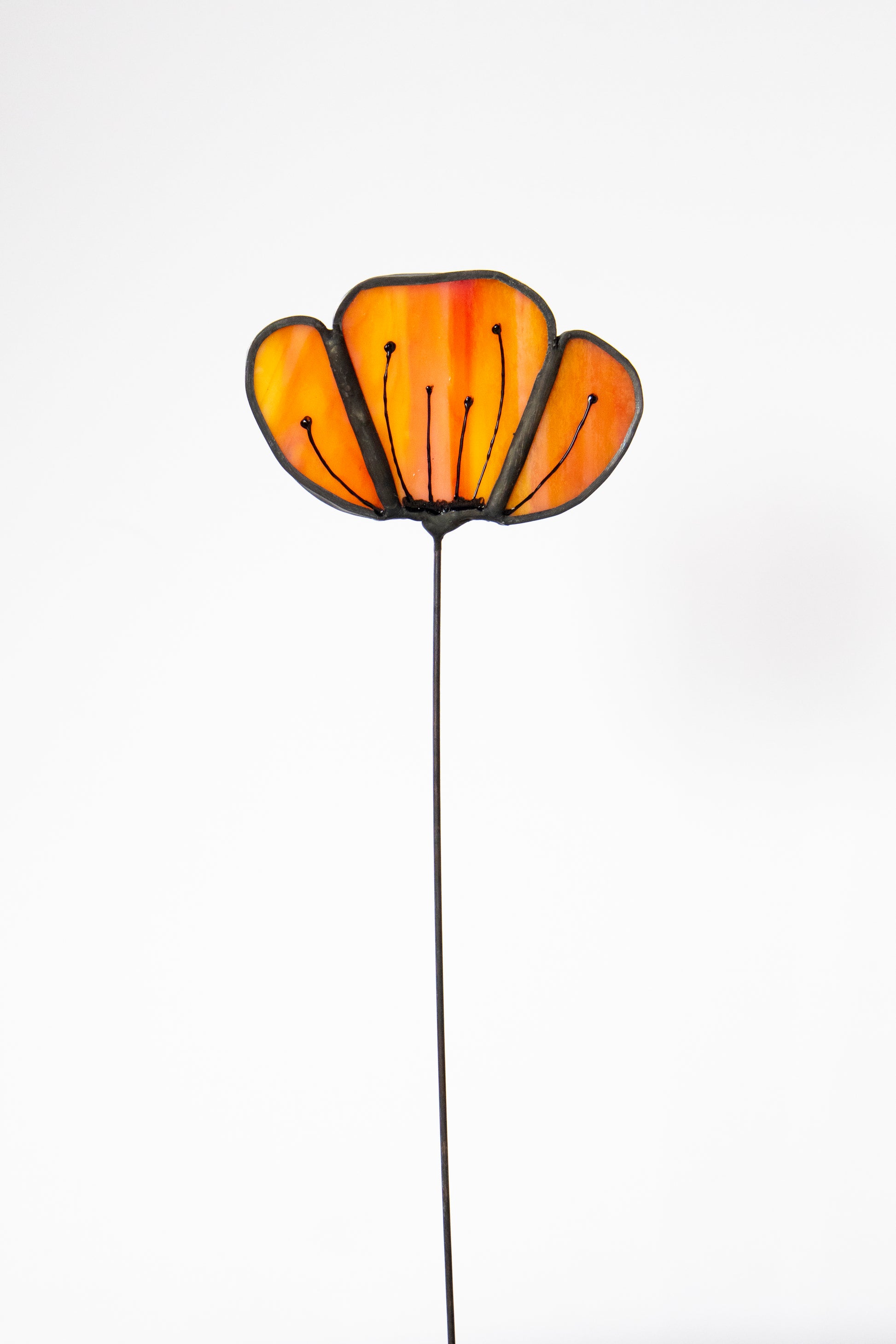 A single stem flower made with opaque orange glass, edged in black.