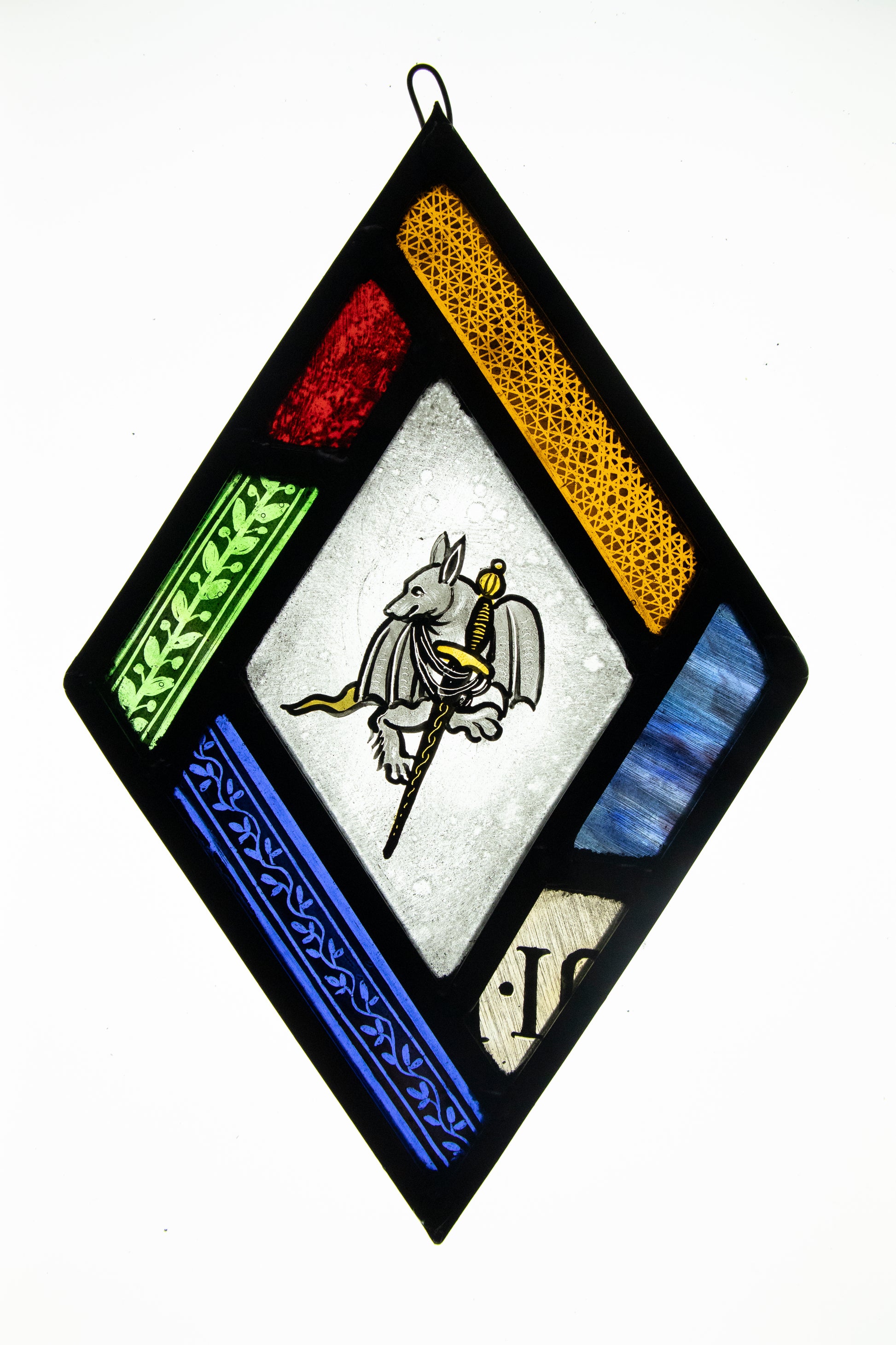 Deborah Lowe's diamond shaped 'Quarry' panels are inspired by the decorative medieval ‘quarries’ that can be found in the windows of historic cathedrals, churches and manor houses. Employing the traditional techniques of grisaille and silver stain, her quarries are hand painted with motifs of animals, birds and whimsical creatures. Each piece is unique, framed by a colourful ‘jumble’ border. They are weatherproof, light fast and, like their historic counterparts, will last for centuries!