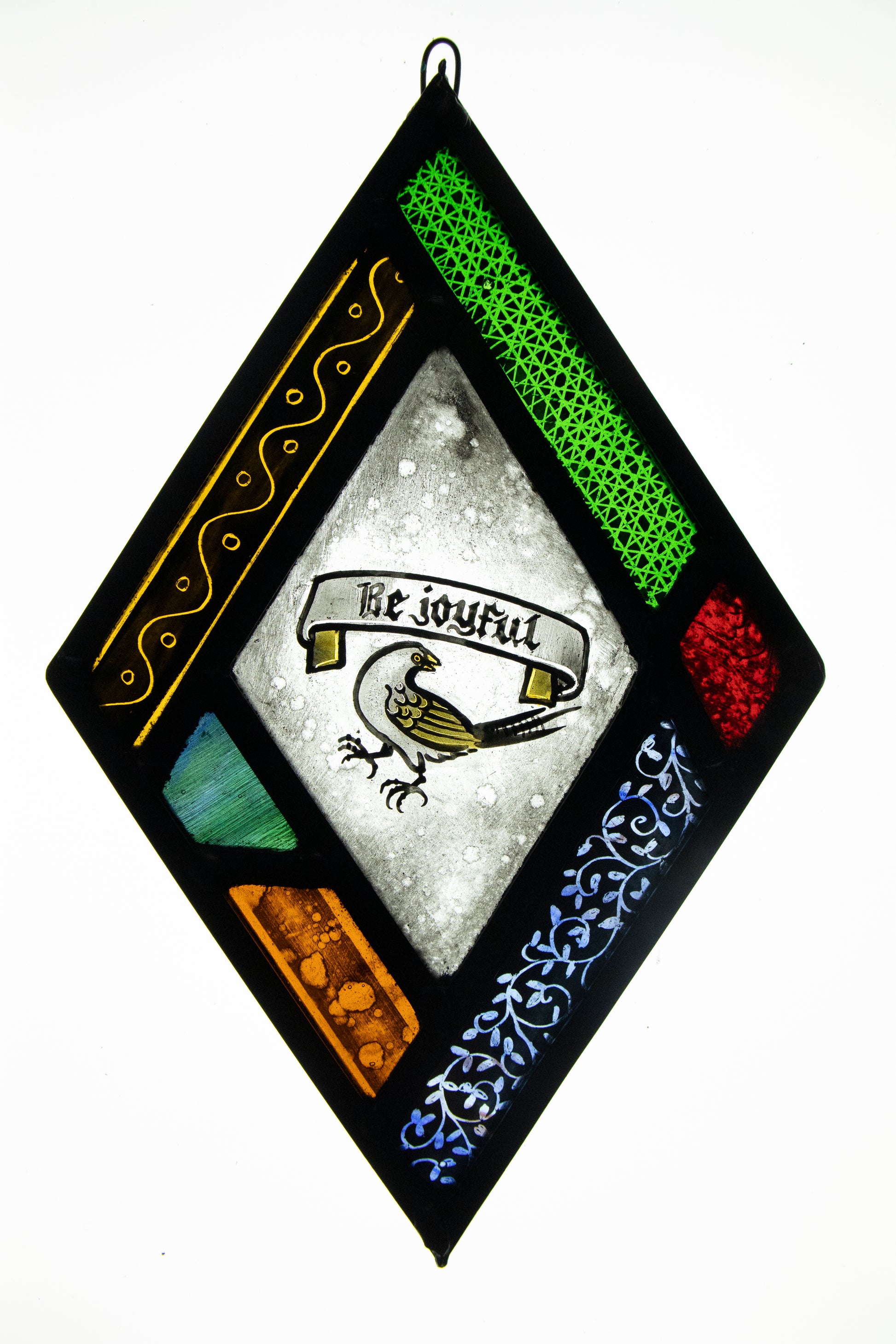 Deborah Lowe's diamond shaped 'Quarry' panels are inspired by the decorative medieval ‘quarries’ that can be found in the windows of historic cathedrals, churches and manor houses. Employing the traditional techniques of grisaille and silver stain, her quarries are hand painted with motifs of animals, birds and whimsical creatures. Each piece is unique, framed by a colourful ‘jumble’ border. They are weatherproof, light fast and, like their historic counterparts, will last for centuries!