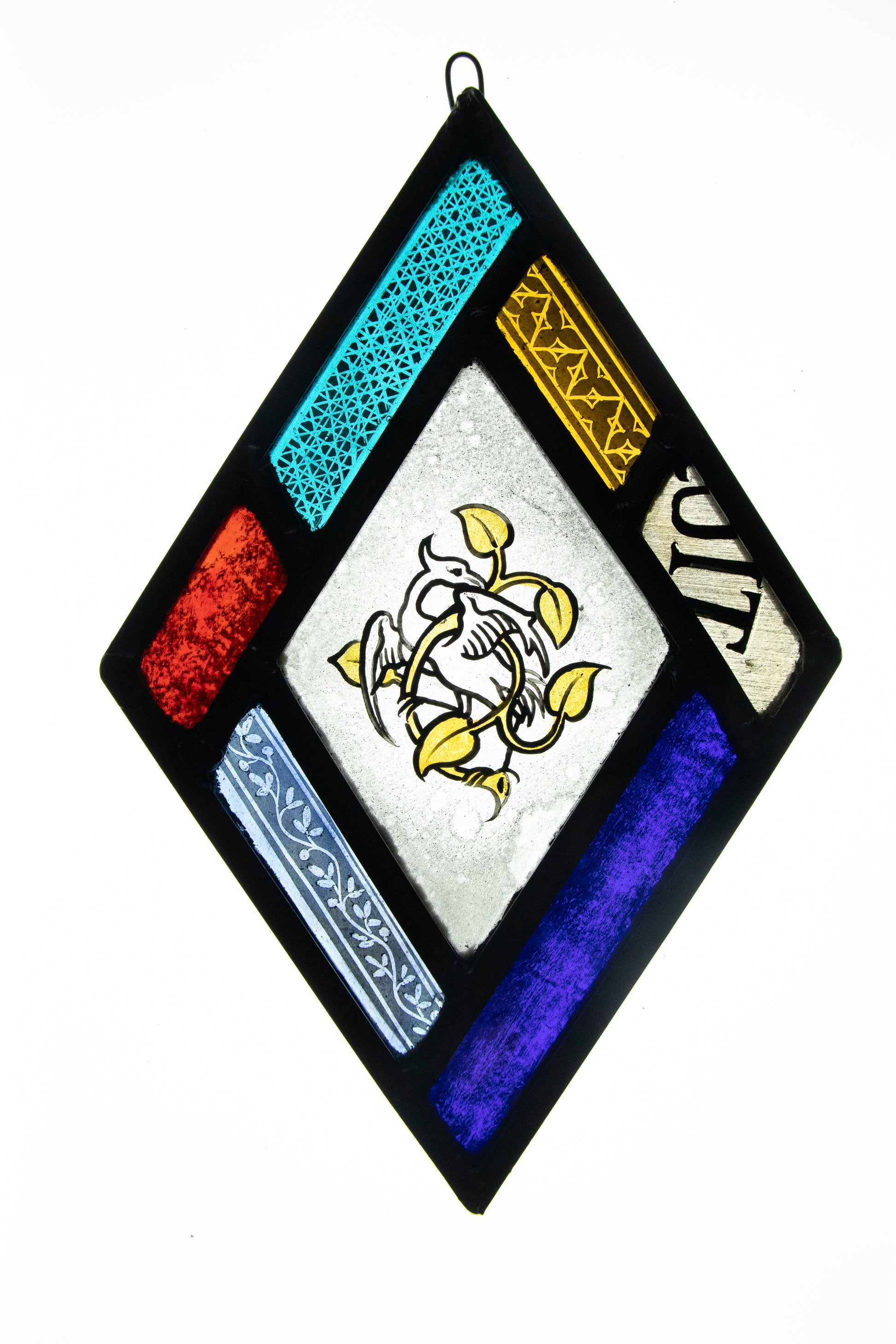 Deborah Lowe's diamond shaped 'Quarry' panels are inspired by the decorative medieval ‘quarries’ that can be found in the windows of historic cathedrals, churches and manor houses. Employing the traditional techniques of grisaille and silver stain, her quarries are hand painted with motifs of animals, birds and whimsical creatures. Each piece is unique, framed by a colourful ‘jumble’ border. They are weatherproof, light fast and, like their historic counterparts, will last for centuries!