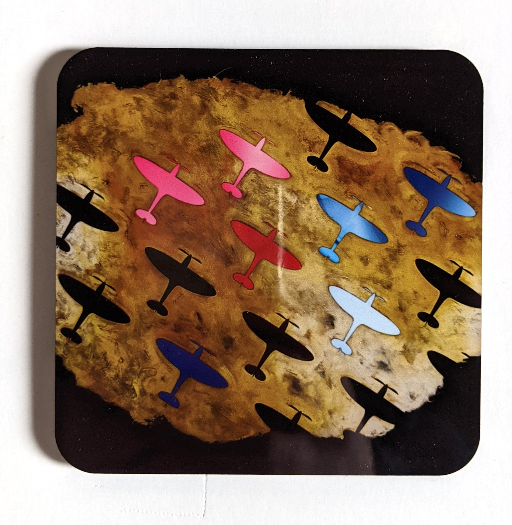 These 4x4" cork-backed coasters come in a set of 4, and are an exclusive to The Stained Glass Museum, based upon the 'Spitfires' stained glass panel from 2017, designed by Brian Clarke.