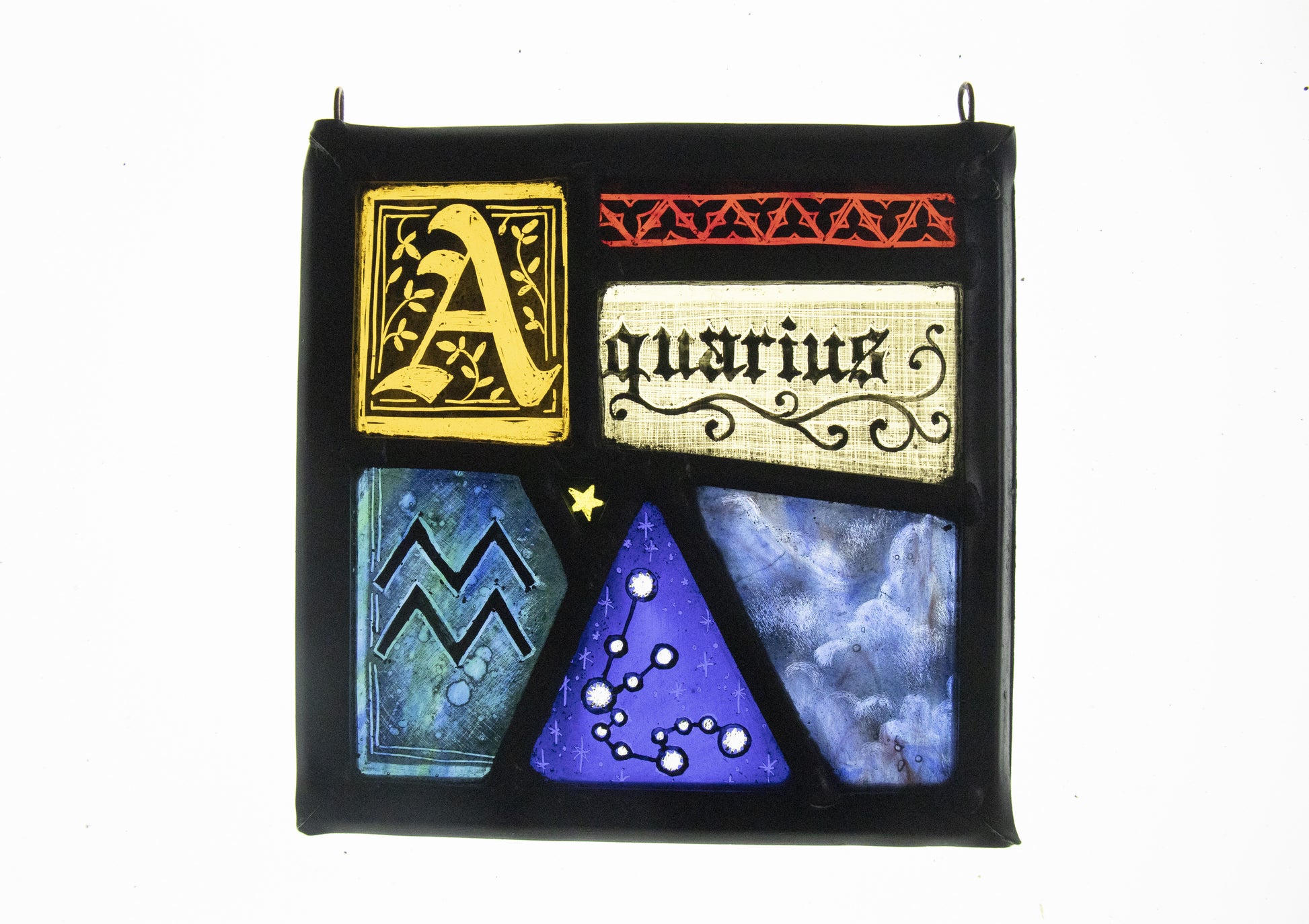 This colourful square panel is inspired by the medieval tradition of preserving stained glass fragments in order to reassemble them, patchwork style, into new windows. These 'jumbles' can be spotted in historic churches and cathedrals all around Britain. Deborah Lowe's Zodiac Jumbles feature one of twelve star signs painted in beautiful calligraphy alongside it's constellation and symbol. Each panel is unique, cut from mouth blown glass, painted by hand, kiln fired and leaded. They are weatherproof, light fast and, like their historic counterparts, will last for centuries!