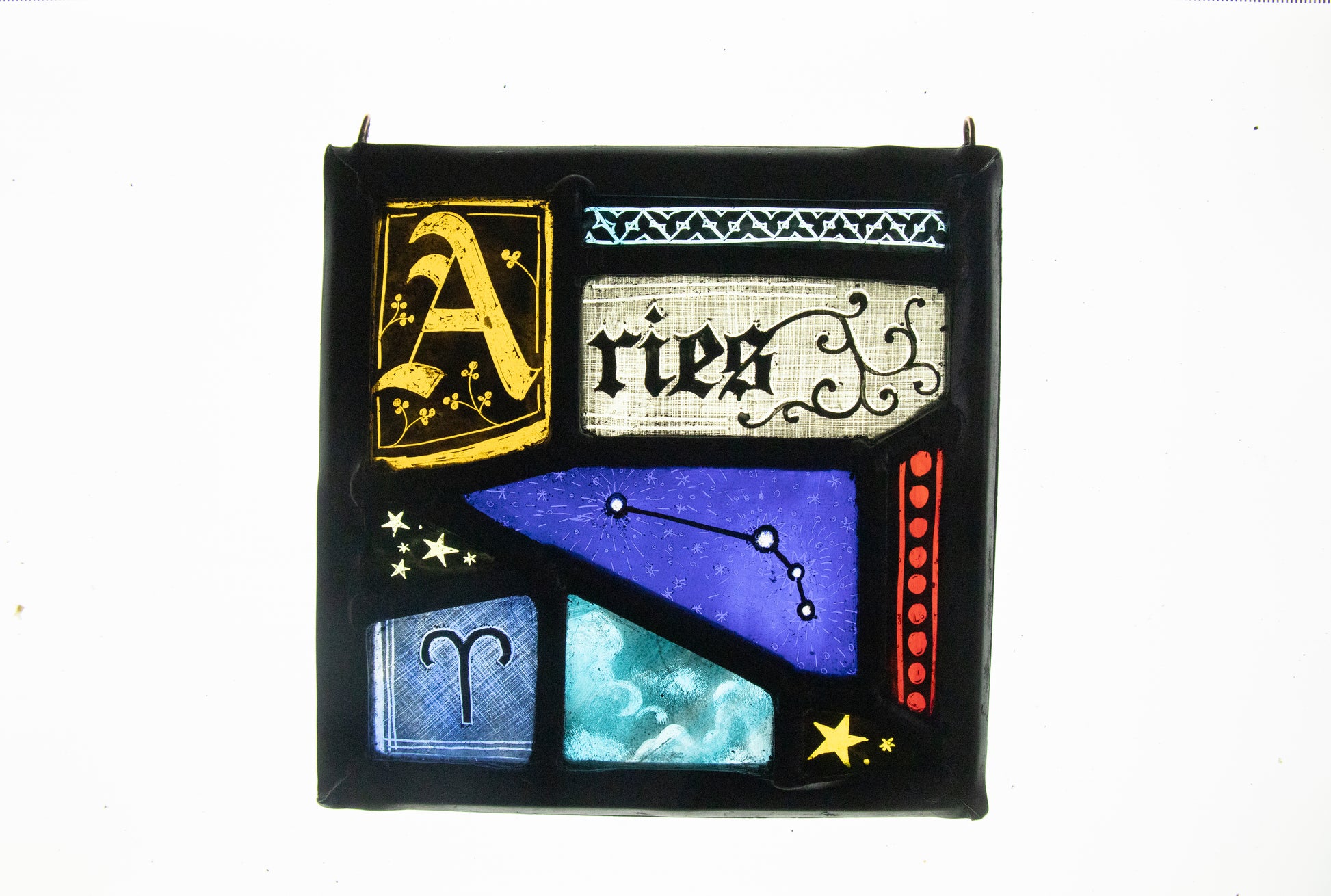 This colourful square panel is inspired by the medieval tradition of preserving stained glass fragments in order to reassemble them, patchwork style, into new windows. These 'jumbles' can be spotted in historic churches and cathedrals all around Britain. Deborah Lowe's Zodiac Jumbles feature one of twelve star signs painted in beautiful calligraphy alongside it's constellation and symbol. Each panel is unique, cut from mouth blown glass, painted by hand, kiln fired and leaded. They are weatherproof, light fast and, like their historic counterparts, will last for centuries!